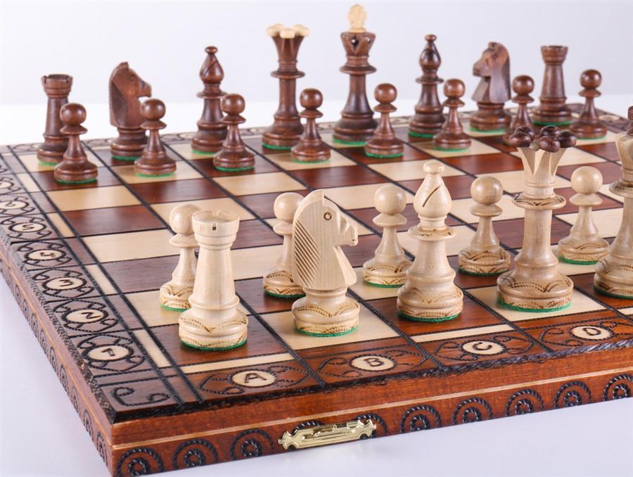 Stylish 19 inch "Consul" is a unique chess set that will be cherished by anyone that loves chess. Special chess piece styling with opposing king and queen colors, plus unique, fine carving make the whole set a special one to own. Experienced, Polish artists create for you this intricate rope-style, hand-etched surface, borders, and pieces, for a set that's hard to find and desirable.